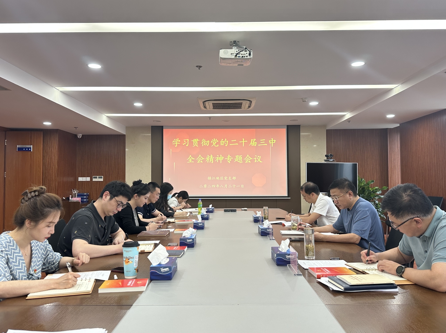 8月21日,鎮江地區黨支部召開專題會議,學習貫徹黨的二十屆三中全會精神。黨支部書記主持會議,全體黨員參加會議。